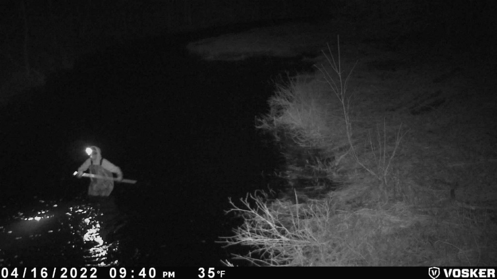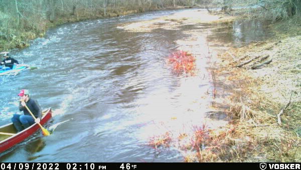 A few volunteers were able to install cameras along the shores of the spawning beds to monitor any harvesting by First Nations peoples and to keep a watch for any non-native poachers. These cameras are high end solar powered VOSKER V200 and allow volunteers to receive immediate text messages with photographs should anyone be on the site. The cameras are secured in lock boxes and hopefully will remain safe during the spawning season. Interestingly enough, these monitoring devices have demonstrated many people make use of Hoople Creek for recreational purposes, such as canoeing and kayaking. These photos are of a few taken by our monitoring cameras.